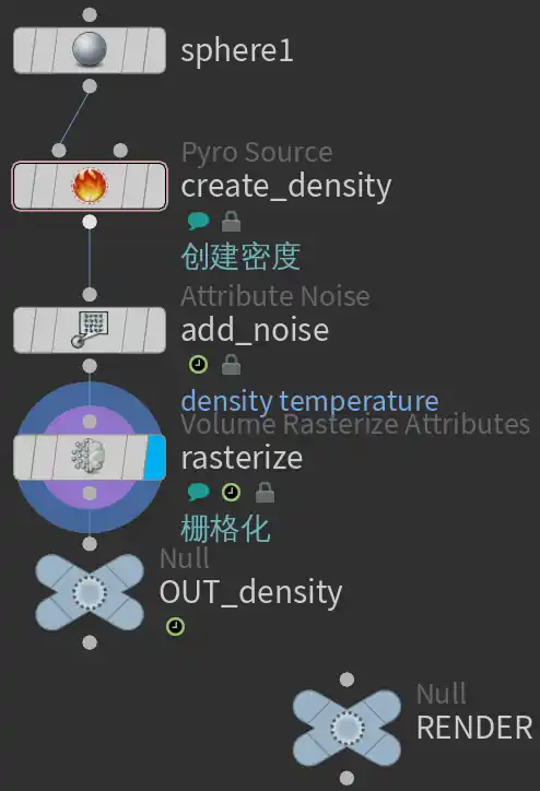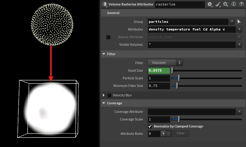 常用参数: - Attributes | 属性:使用哪些属性作为创建 VDB 的基础(这里生效的似乎只有 density 和 temperature) - Voxel Size | 体素大小:就是体素的分辨率,这里使用了 HScript 生成 - Normalize by Clamped Coverage | 基于钳制后的覆盖范围进行规范化处理:启用此选项会将采样的体积乘以覆盖率,从而在由粒子覆盖的区域之间产生平滑过渡。