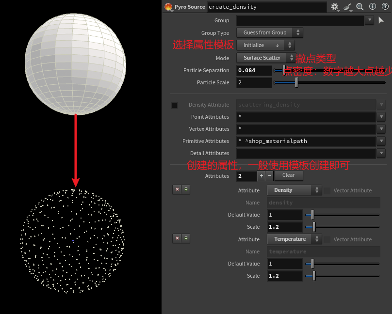 作用:从模型创建点,并为点添加属性,以便进行火焰或烟雾模拟。