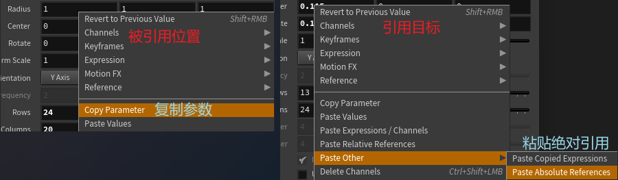 (复制参数),并在目标处 Paste Absolute References (粘贴绝对引用)